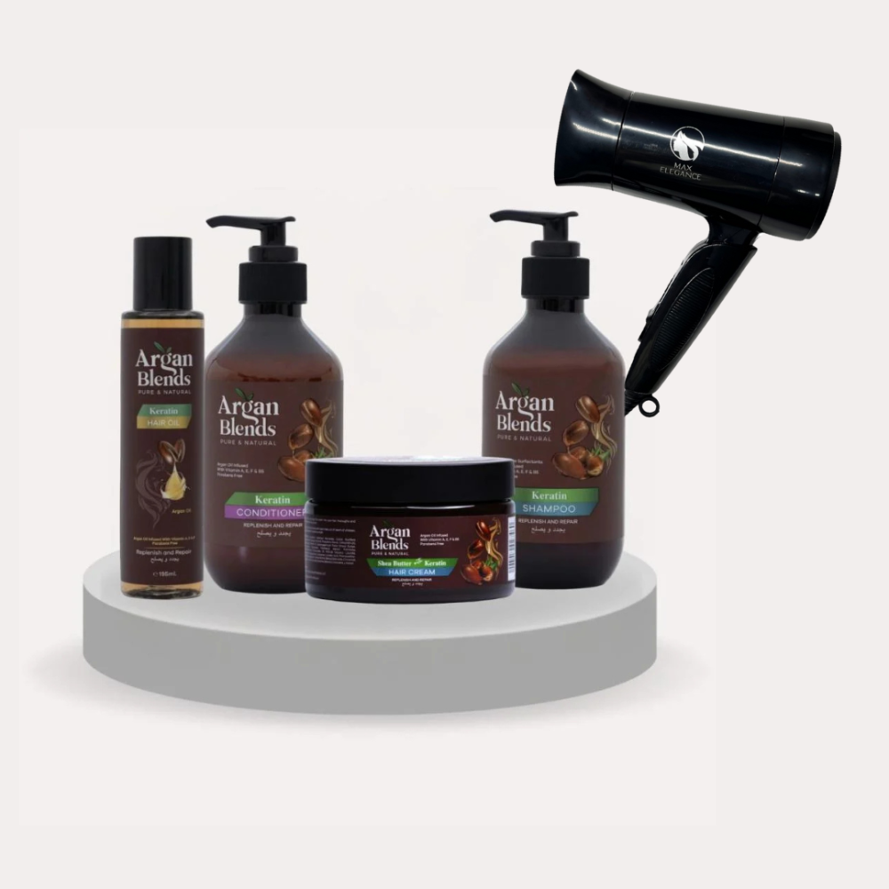 طقم مجموعة الكيراتين (شامبو - بلسم - كريم - زيت) مع استشوار مجاناً